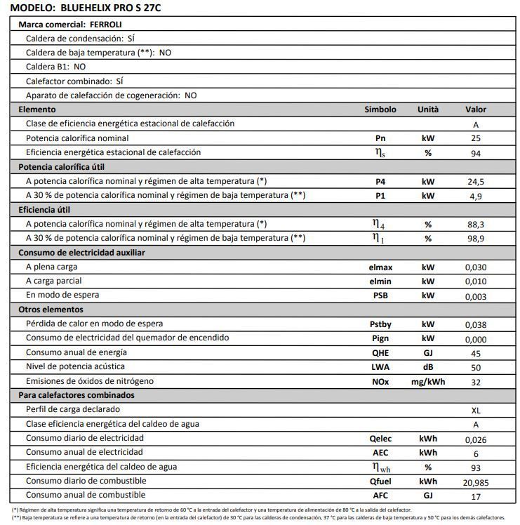 Además la nueva Caldera Ferroli Bluehelix Pro Slim S 27 C, mediante la conexión de una sonda exterior y del cronocomando ROMEO W/W RF mejoran notablemente su nivel de eficiencia energética alcanzando la clase A+, según normativa ErP.