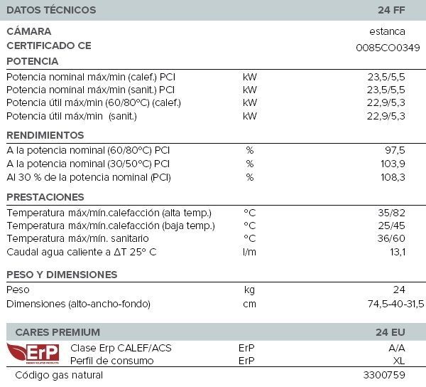 CARES PREMIUM es capaz de proporcionar hasta 35% de ahorro en la factura de gas, en comparación con una caldera estándar de 10 años de antiguedad. Menor consumo de energía, más ahorro y mayor eficiencia energética gracias a nuevas tecnologías. Reducción de las emisiones contaminantes respetando las más estrictas normativas europeas. Compatible con instalación solar, mejor aprovechamiento de la energía y las fuentes renovables, logrando mayor rendimiento.