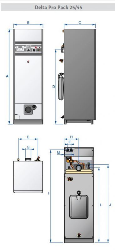 Caldera de pie de doble servicio a gas o gasóleo, con interacumulador ACS inox integrado y bomba de calefacción.
