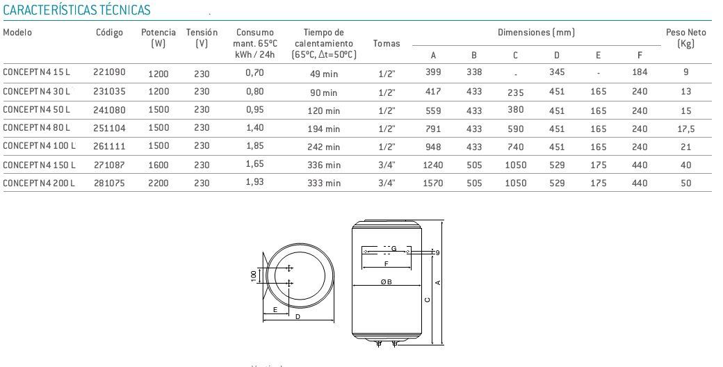 Con su nuevo termostato exterior la gama Concept permite al usuario elegir la temperatura deseada, asegurando un mayor ahorro energético en periodos de menor consumo de agua caliente La nueva amplia gama de Termos eléctricos Themor de la Serie Concept N4 nos ofrecen termos de instalación vertical con capacidades desde 15 litros hasta 200 litros y termos de instalación horizontal con litrajes desde 50 hasta 100 litros. Thermor nos ofrece en estos modelos de termos eléctricos una garantía hasta 7 años en la cuba y 5 años en componentes eléctricos y 2 años garantía total incluyendo mano de obra y desplazamiento.
